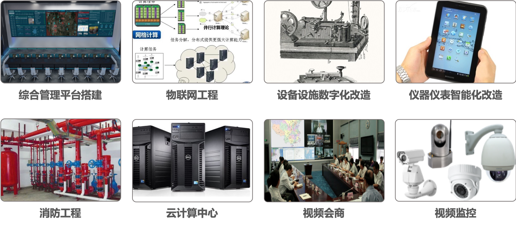 基于物聯(lián)網(wǎng)、云計(jì)算、網(wǎng)絡(luò)等主流IT技術(shù),提供網(wǎng)絡(luò)、硬件和信息系統(tǒng)集成服務(wù)。如綜合管理平臺搭建、物聯(lián)網(wǎng)工程、設(shè)備設(shè)施數(shù)字化改造、儀器儀表智能化改造、消防工程、云計(jì)算中心、視頻會商、視頻監(jiān)控等。
